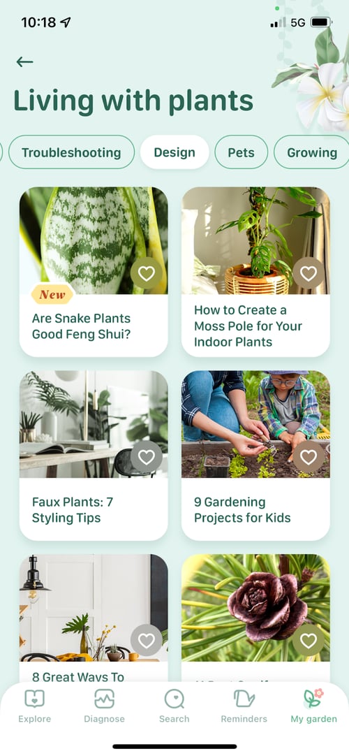 Expert editorials from The Spruce are easy to peruse with a single tap from the Blossom homescreen. Users can choose from a broad range of topics, from which houseplants are safe for cats and dogs to how to dry and store flowers. A convenient save feature even allows users to “heart” their favorite articles and revisit them later. This beautiful and functional library is sure to keep users coming back again and again for helpful tips and ideas.