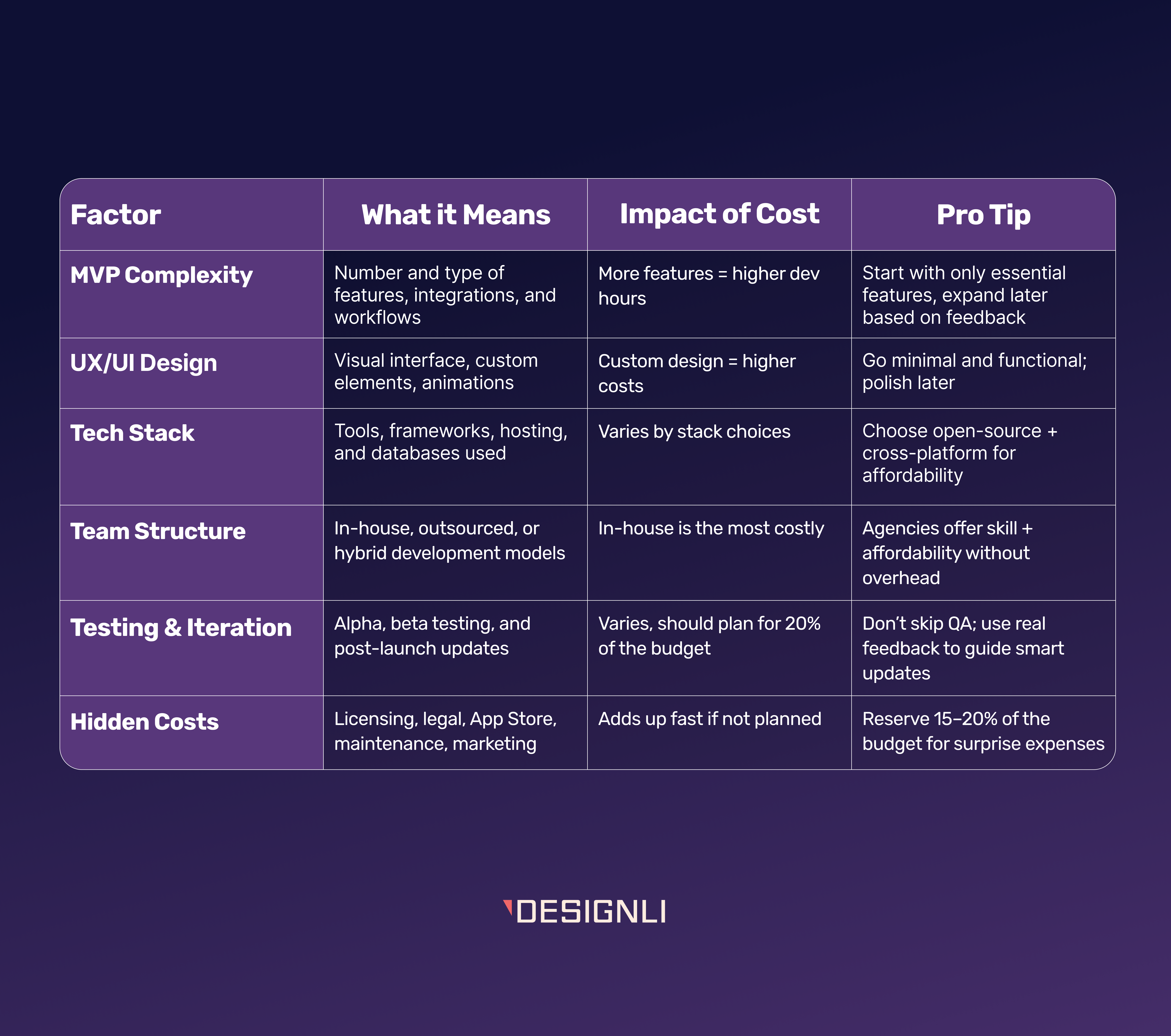 Here’s a summary table to review the six key factors that impact the cost of your MVP: