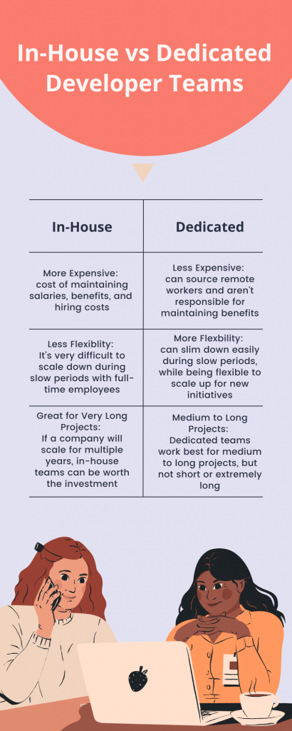 While they can often save money, dedicated software development teams are an investment compared to a less efficient or specialized in-house team.