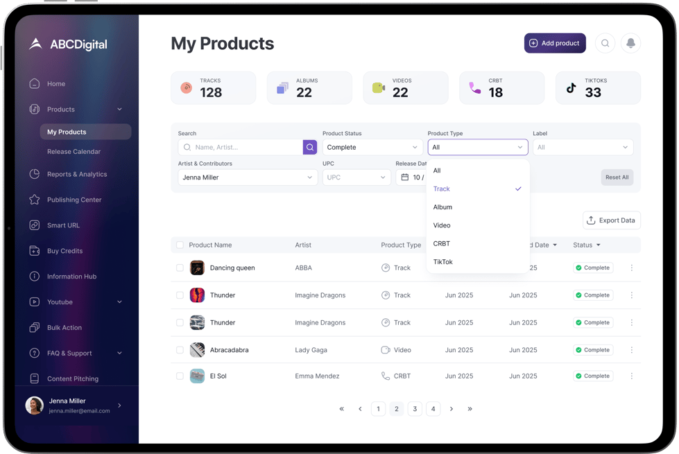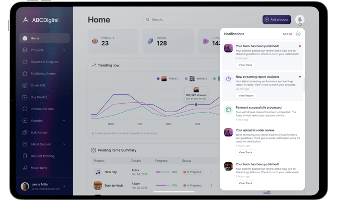 When offering music creators tools to manage and track their content across platforms, ABC Digital faced the challenge of providing a modern, responsive interface that simplified a complex process. Designli's no-cost Impact Week brought clarity: the new ABC Digital web frontend offers a centralized, intuitive experience that empowers creators to see how their content is being shared and monetized in real-time.